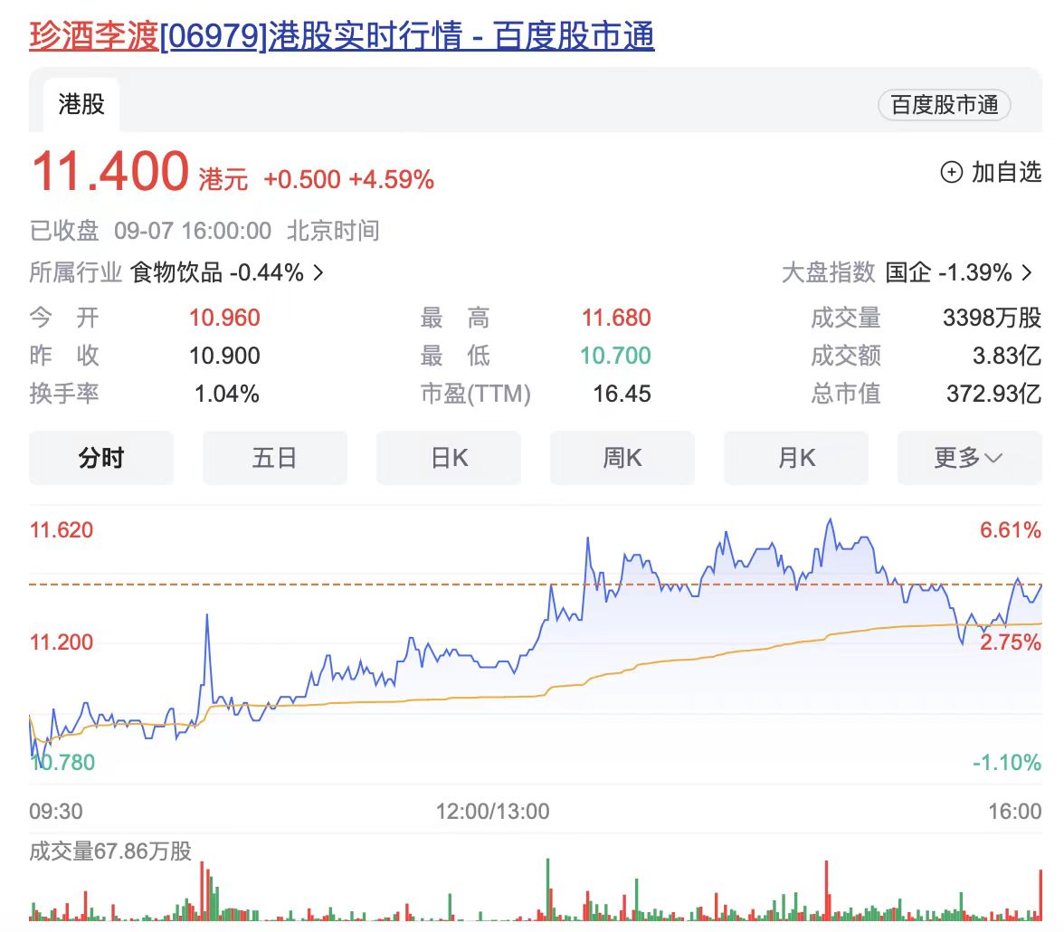 發展趨勢方面,今年4月27日,珍酒李渡在港交所上市,成為港股白酒第一股、中國醬香白酒第二股。珍酒李渡因在基本面、流動性等方面的優異表現,本周正式納入“港股通”交易。9月4日-7日,在大盤整體表現不佳的情況下,珍酒李渡逆勢四連漲,累計漲幅超30%,實現“港股通”第一個交易周的良好開局。