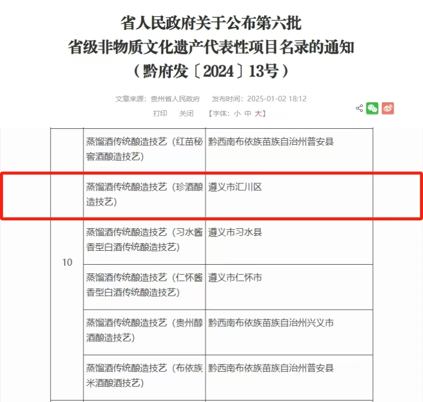 近日,貴州省人民政府公布第六批省級非物質文化遺產代表性項目名錄,“珍酒釀造技藝”成功入選。
