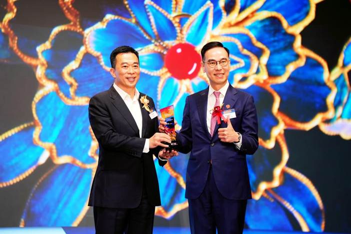 △香港股票分析師協會主席鄧聲興(右)為珍酒李渡頒獎