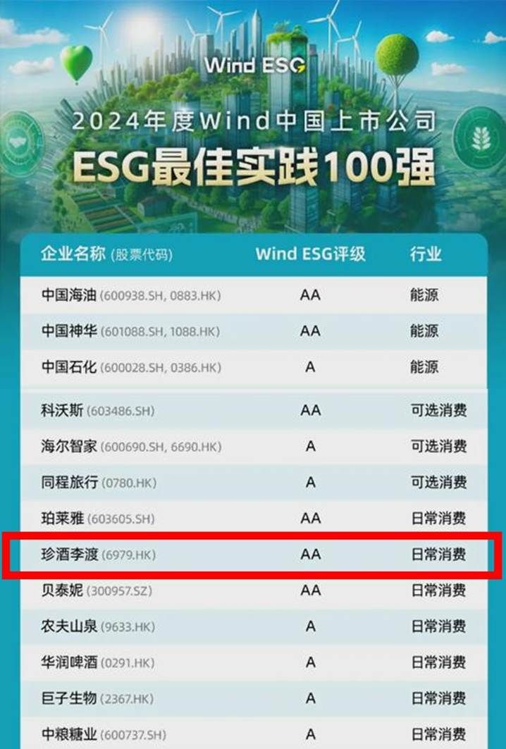 其實,珍酒李渡ESG實踐成效早已獲行業關注和認可,其連續兩年從A股和港股的數千家上市公司中脫穎而出,入選2023年度和2024年度“Wind中國上市公司ESG最佳實踐100強”,與中國石化、中國移動、中國平安、騰訊控股、寧德時代等知名企業并肩而立,且在白酒行業排名第一。