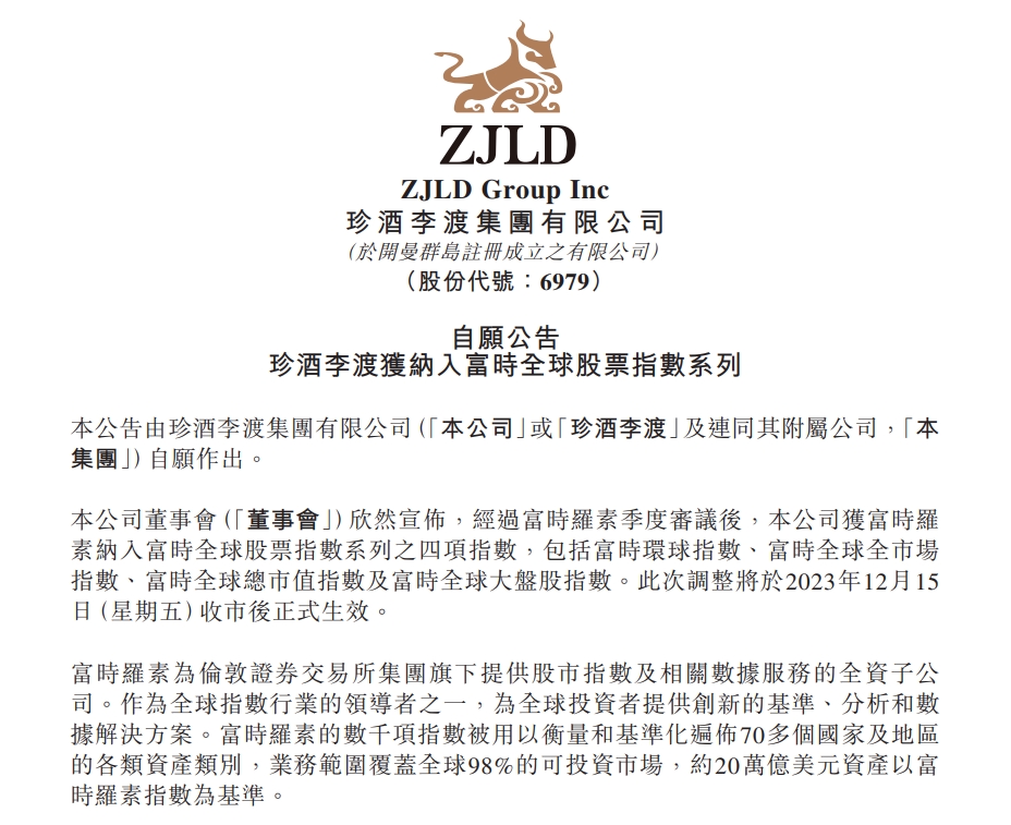 12月4日,珍酒李渡集團(6979.HK)發布公告,公司獲納入富時羅素全球股票指數系列(GEIS)的四項重要指數,包括富時環球、富時全球全市場、富時全球總市值和富時全球大盤股等指數,并將于12月15日收盤后正式生效。 ...
