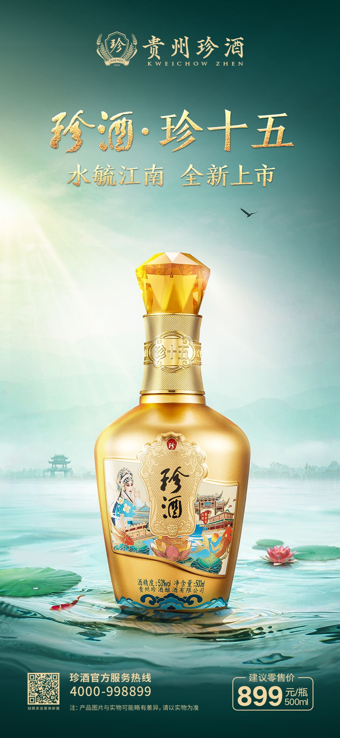 珍酒·珍十五(水毓江南)是貴州珍酒傾力打造的一款彰顯江南文化底蘊的珍品佳釀。瓶身采用經典天球瓶,蘇繡、昆曲、秦淮燈彩、蘇州園林的文化韻味在此匯集,描繪出一幅吳韻漢風的文化長卷。