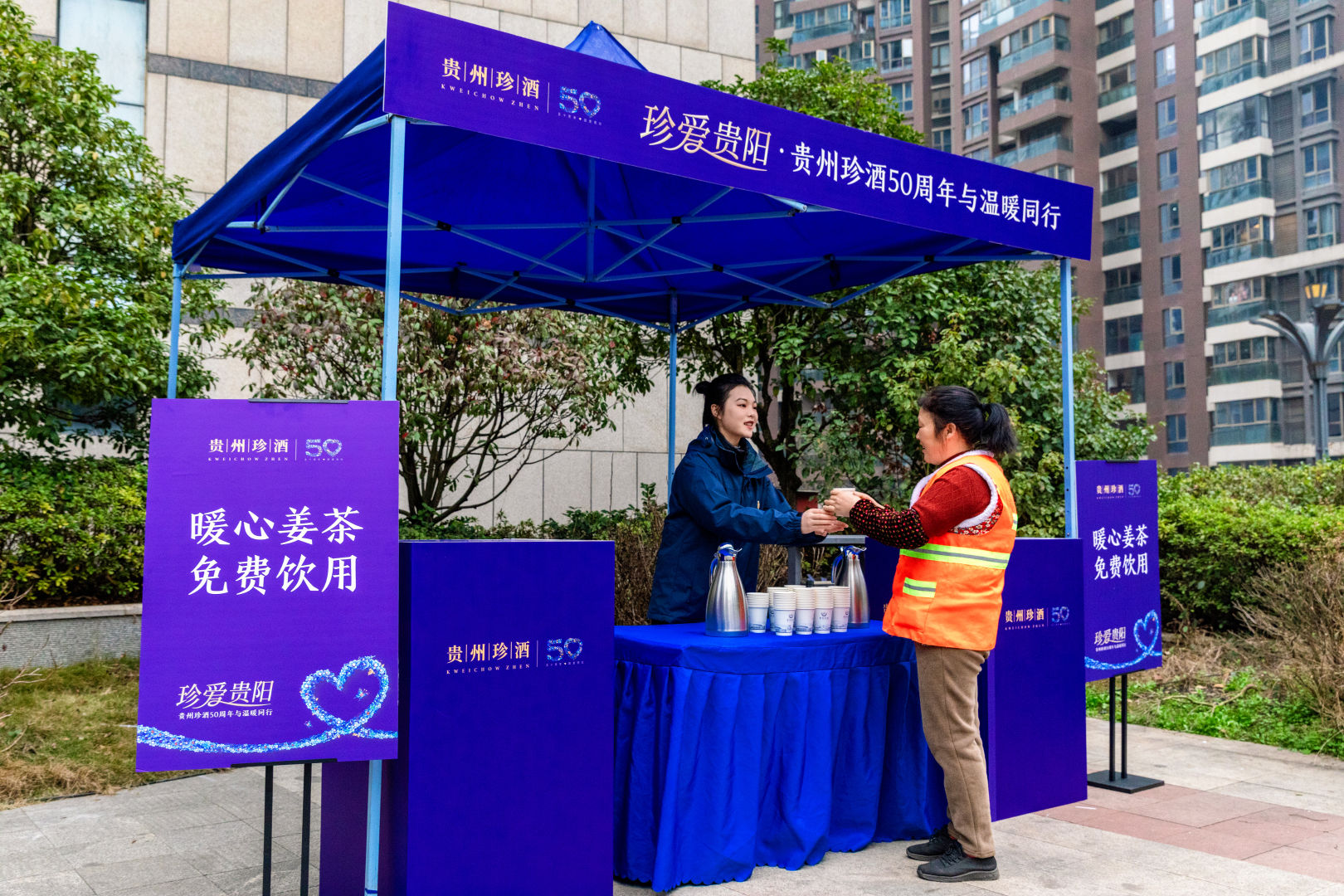 活動當天,貴州珍酒精心準備了保溫杯、圍巾、手套、大米、食用油、豬肉以及珍酒產品等慰問品,送到環衛工人手中。珍酒還設置愛心亭,為廣大環衛工人免費提供姜茶,帶來濃濃暖意。